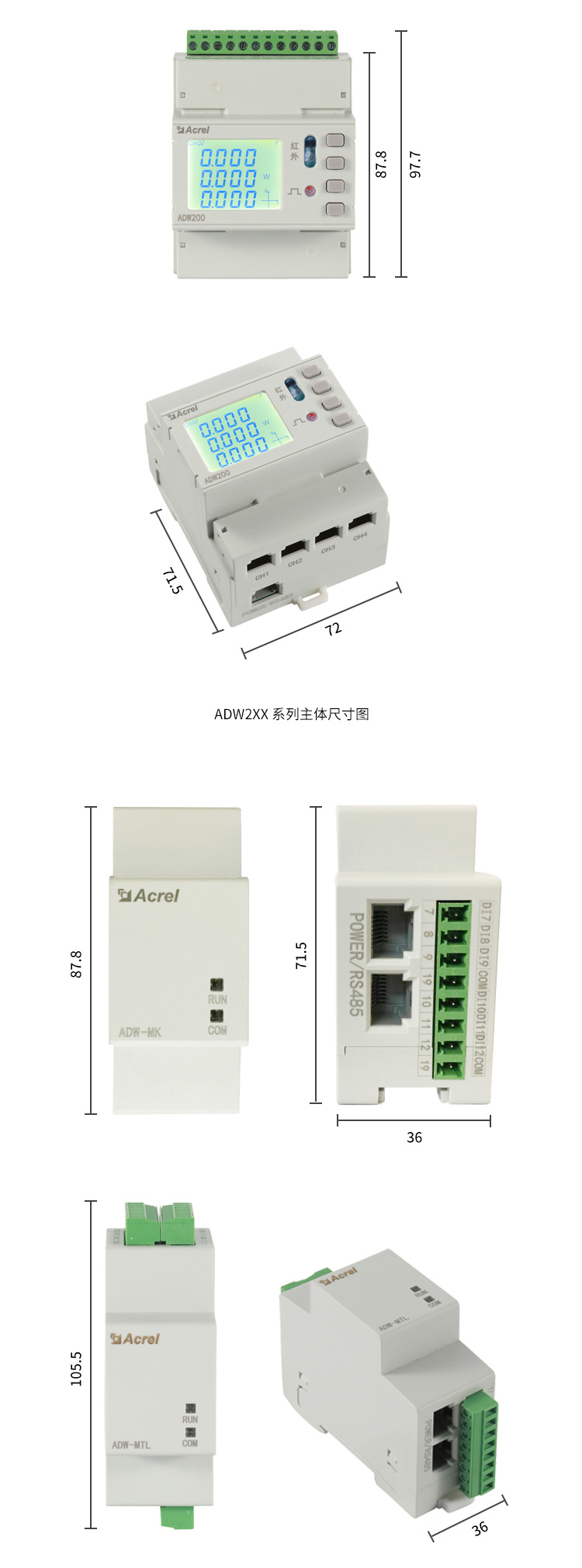 ADW2xx系列導軌式多回路電力儀表方便用戶進行用電監測、集抄和管理??伸`活安裝于配電箱內,實現對不同區域和不同負荷的分項電能計量,統計和分析。