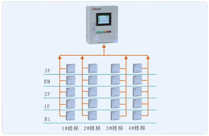 系統采用安科瑞防火門監控系統,該系統主要采用分層分布式網絡結構,系統結構為:站控管理層、網絡通訊層和現場設備層。其中黃巖博物館項目現場設備分布為B1至3F常閉防火門。該系統監控所有樓道內的常閉防火門且實時監測防火門狀態,如有異常會后臺報警。所有監測模塊通過二總線鋪設至消防控制室,防火門監控主機從而完成對監測模塊的采集并監控。