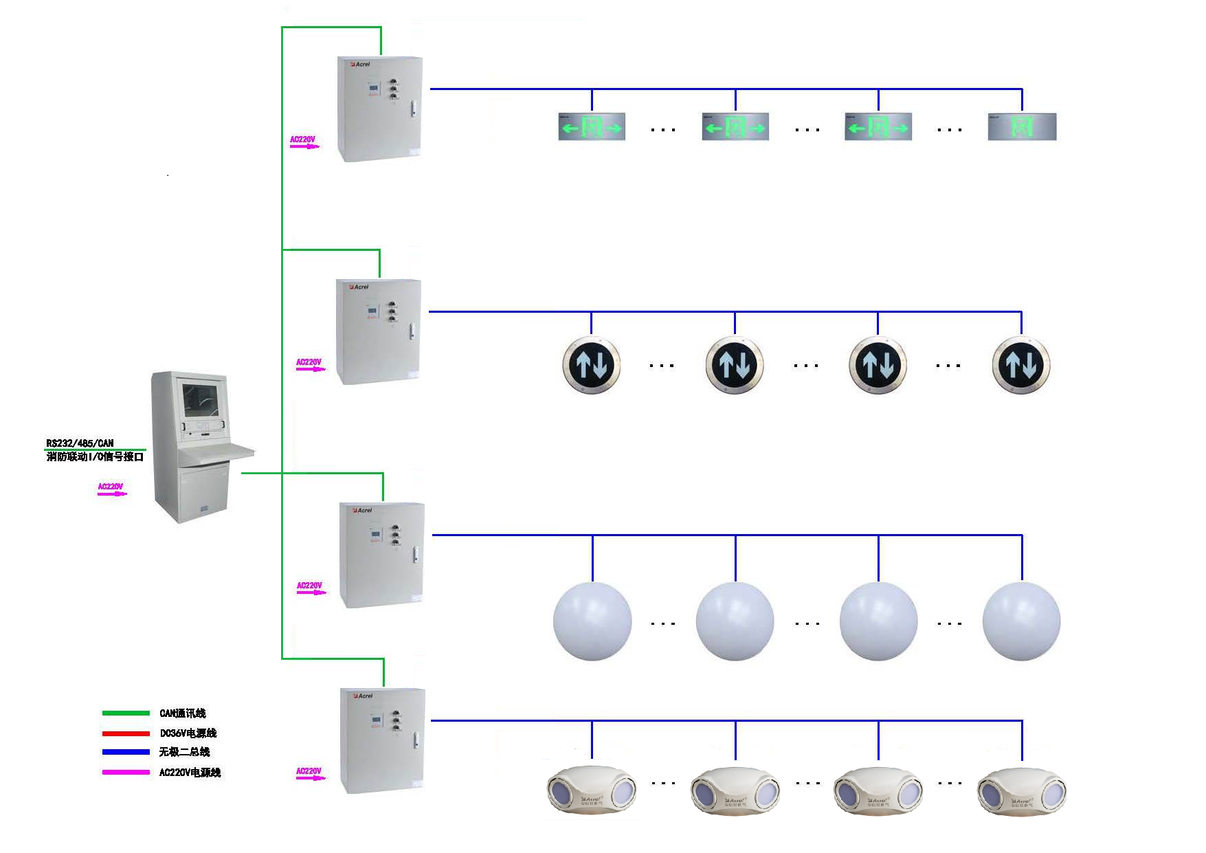 阿克蘇數(shù)據(jù)機(jī)房項(xiàng)目的消防應(yīng)急照明和疏散指示系統(tǒng)是安科瑞研發(fā)的集監(jiān)視、報(bào)警、管理于一體的計(jì)算機(jī)測控系統(tǒng),該系統(tǒng)可以通過控制器接收火災(zāi)報(bào)警系統(tǒng)的信號(hào),當(dāng)火災(zāi)發(fā)生的時(shí)候,消防應(yīng)急照明和疏散指示系統(tǒng)具有智能動(dòng)態(tài)導(dǎo)光功能,系統(tǒng)根據(jù)火災(zāi)報(bào)警聯(lián)動(dòng)信號(hào)及災(zāi)情現(xiàn)場的具體情況通過計(jì)算機(jī)選擇一條正確逃生路,再通過改變標(biāo)志燈的箭頭方向?yàn)樘由藛T提供更有效的疏散逃生路。當(dāng)發(fā)生緊急斷電或電源供電不足時(shí),應(yīng)急照明集中電源能夠給燈具供電,保證整個(gè)系統(tǒng)的正常工作。該系統(tǒng)由控制器、集中電源、消防應(yīng)急標(biāo)志燈具和消防應(yīng)急照明燈具等組成,系統(tǒng)結(jié)構(gòu)合理、功能強(qiáng)大、可靠性高、維護(hù)方便。