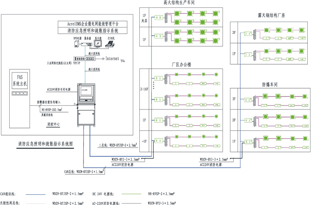消防應急照明和疏散指示系統(tǒng)主要由應急照明控制器、消防應急照明集中電源或應急照明配電箱、消防應急燈具等幾部分組成。該套系統(tǒng)符合國家現(xiàn)行的行業(yè)規(guī)范,可以滿足與AcrelEMS企業(yè)微電網(wǎng)管理云平臺或火災自動報警系統(tǒng)等進行數(shù)據(jù)交換和共享。