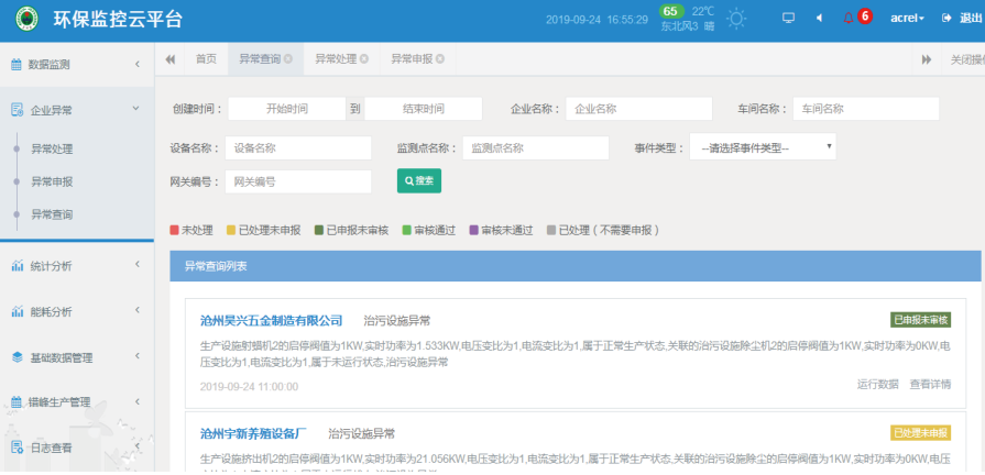AcrelCloud-3000環(huán)保用電監(jiān)管云平臺依托創(chuàng)新的物聯(lián)網(wǎng)電力傳感技術(shù),實時采集企業(yè)總用電、生產(chǎn)設(shè)備及環(huán)保治理設(shè)備用電數(shù)據(jù),通過關(guān)聯(lián)分析、超限分析、停電分析、停限產(chǎn)分析,結(jié)合及時發(fā)現(xiàn)環(huán)保治理設(shè)備未開啟、異常關(guān)閉及減速、空轉(zhuǎn)、降頻等異常情況,同時通過數(shù)據(jù)分析還可以實時監(jiān)控限產(chǎn)和停產(chǎn)整治企業(yè)運行狀態(tài),用戶可以利用PC、手機、平板電腦等多種終端實現(xiàn)對平臺的訪問。