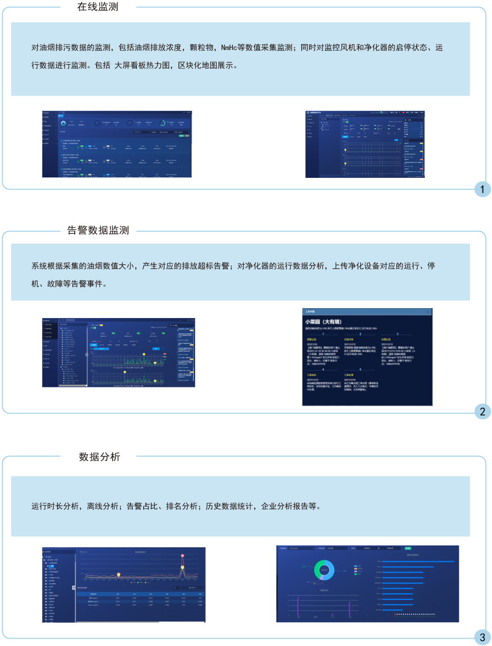 為了彌補(bǔ)現(xiàn)存餐飲行業(yè)在煙油監(jiān)測(cè)上的漏洞,同時(shí)便利監(jiān)管部門(mén)的監(jiān)察,安科瑞油煙監(jiān)測(cè)云平臺(tái)應(yīng)運(yùn)而生。油煙監(jiān)測(cè)模塊通過(guò)2G/4G與云端平臺(tái)進(jìn)行通信和數(shù)據(jù)交互,系統(tǒng)能夠?qū)ζ髽I(yè)餐飲設(shè)備的開(kāi)機(jī)狀態(tài)、運(yùn)行狀態(tài)進(jìn)行監(jiān)控;實(shí)現(xiàn)開(kāi)機(jī)率監(jiān)測(cè),凈化效率監(jiān)測(cè),設(shè)施停運(yùn)告警,待清洗告警,異常告警等功能;對(duì)采集數(shù)據(jù)進(jìn)行統(tǒng)計(jì)分析、排名等統(tǒng)計(jì)功能;較之傳統(tǒng)的靜電監(jiān)測(cè)方案,更具安全性和實(shí)效性。